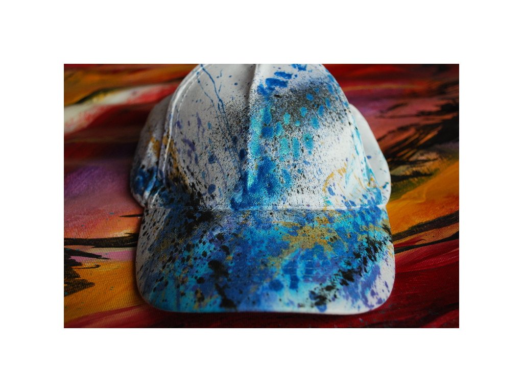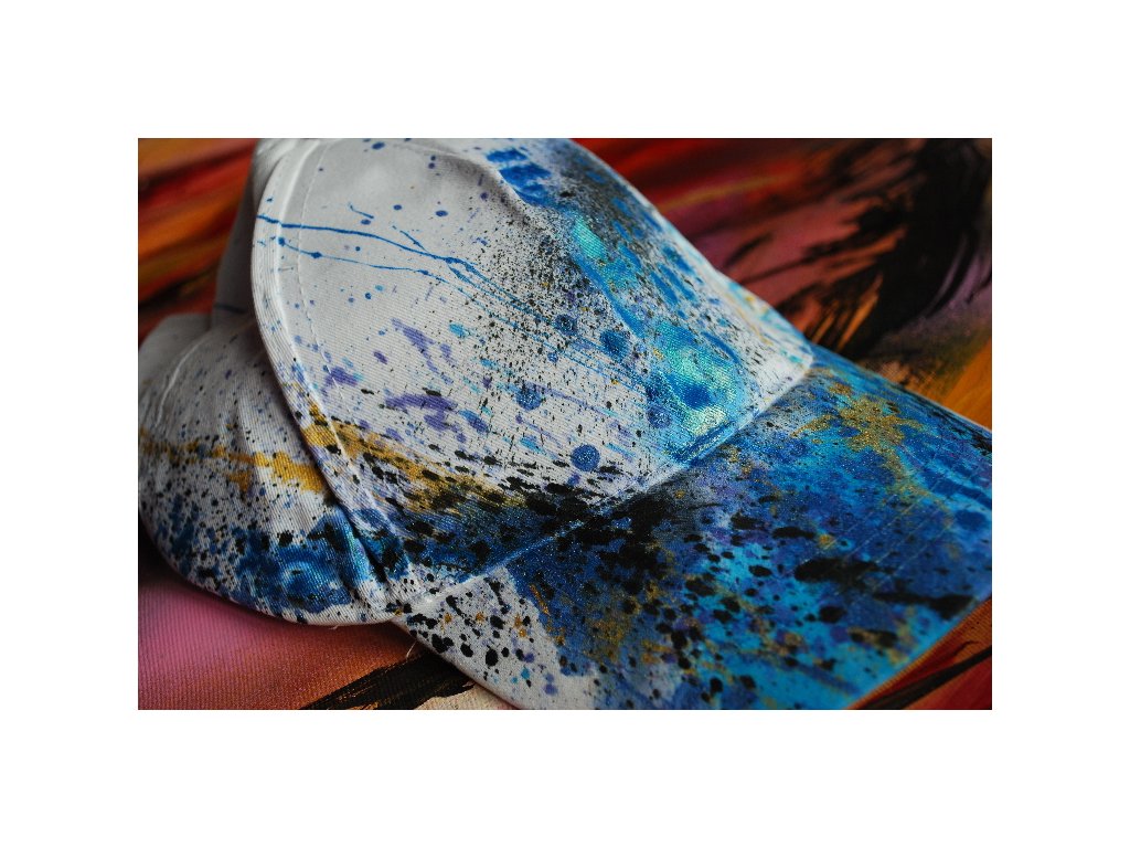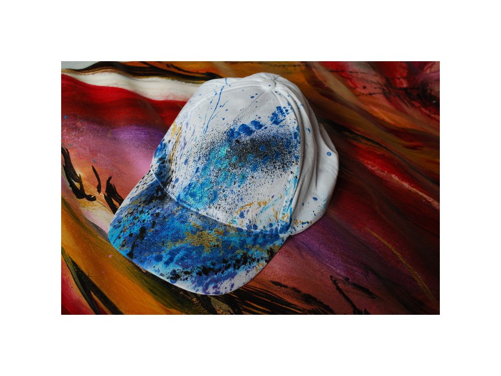 Bílá čepice s abstraktním ručně malovaným motivem. Univerzální velikost. Možnost regulace velikosti upínáním. Ruční praní.